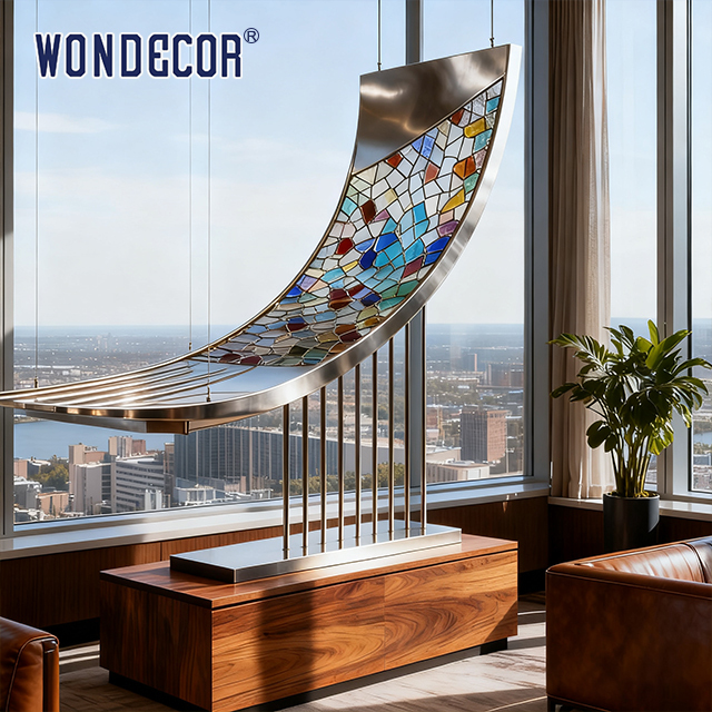 - Unieke artistieke expressie:De koude textuur van roestvrij staal in combinatie met het kleurrijke licht en de schaduw van glas in kleur creëert een opvallend visueel contrast.of grote vormen, terwijl de lichtdoorlatendheid van glas in kleur dromerige, gelaagde licht- en schaduweffecten in kamers met natuurlijke of kunstmatige verlichting veroorzaakt.Dit transformeert gewone woonruimtes in kunstgelegenheden die functionaliteit en esthetiek combineren..