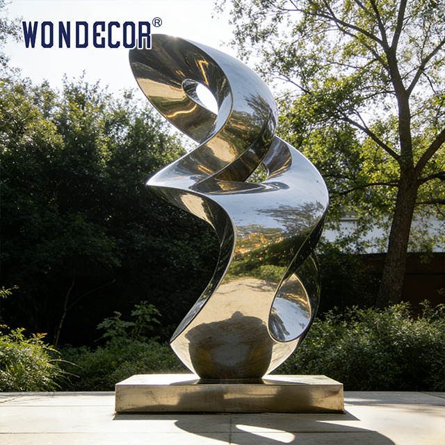 Deze "Infinite Essence" roestvrijstalen sculptuur, met zijn vloeiende oneindigheidssymboolvorm, is een ideale artistieke installatie voor buitenlandschappen en commerciële ruimtes. Gemaakt van hoogglans spiegelafgewerkt roestvrij staal, reflecteert het niet alleen de omringende groen en daglicht onder natuurlijk licht om dynamische licht- en schaduweffecten te creëren die evolueren met de omgeving, maar het biedt ook uitzonderlijke weerbestendigheid — corrosiebestendig en UV-bestendig, het behoudt tientallen jaren een heldere, glanzende uitstraling buitenshuis met minimaal onderhoud. De minimalistische vloeiende lijnen harmoniëren perfect met natuurlijke ecologische omgevingen en dienen als een opvallend visueel middelpunt, terwijl ze de artistieke connotatie van oneindigheid, cyclischheid en vitaliteit overbrengen.